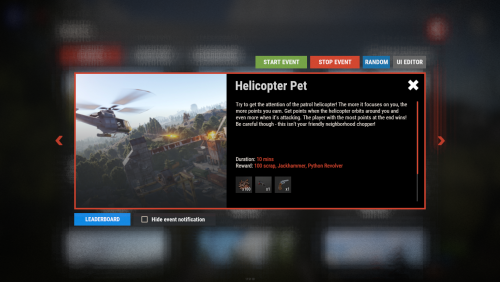 - HelicopterPet - Try to get the attention of the patrol helicopter! The more it focuses on you, the more points you earn. Get points when the helicopter orbits around you and even more when it's attacking. The player with the most points at the end wins! Be careful though - this isn't your friendly neighborhood chopper!