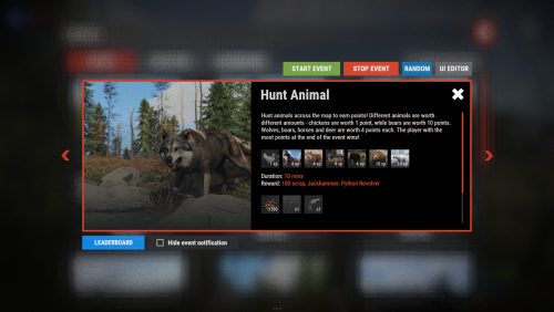 - HuntAnimal - Hunt animals across the map to earn points! Different animals are worth different amounts - chickens are worth 1 point, while bears are worth 10 points. Wolves, boars, horses, and deer are worth 4 points each. The player with the most points at the end of the event wins!