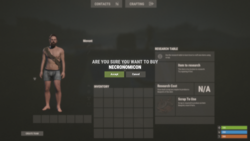 { "Book Item Settings": { "Display Name": "Necromonicon", "ShortName": "xmas.present.small", "Skin": 2537078809 }, "Work with Notify?": true, "Cost": 100, "Permission": "", "Economy": { "Type (Plugin/Item)": "Plugin", "Plugin name": "Economics", "Balance add hook": "Deposit", "Balance remove hook": "Withdraw", "Balance show hook": "Balance", "ShortName": "scrap", "Display Name (empty - default)": "", "Skin": 0 }, "Active Color": { "HEX": "#74884A", "Opacity (0 - 100)": 95.0 }, "Disactive Color": { "HEX": "#595651", "Opacity (0 - 100)": 75.0 }, "Effect (empty - disable)": "assets/prefabs/deployable/research table/effects/research-success.prefab" }