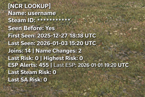 /ncr.reset ...........username or steam id Reset a player's NCR history