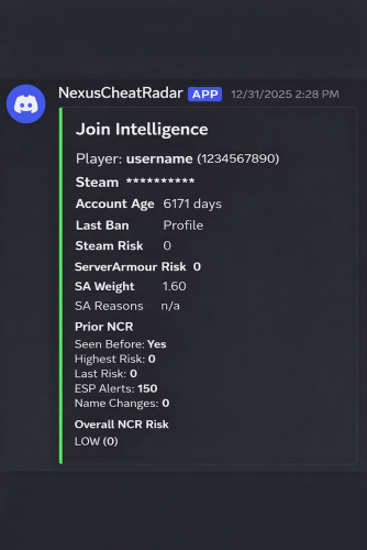 NexusCheatRadar is a lightweight admin-focused anti-cheat intelligence tool for Rust that detects ESP, no-recoil, and aimbot behavior, aggregates signals into a unified risk score, and reports findings to Discord without auto-bans or gameplay interference.