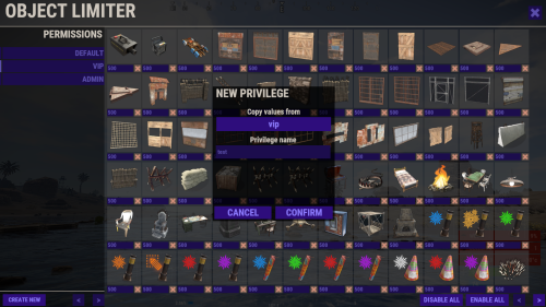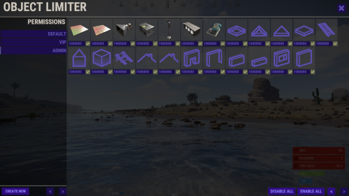 - Limit Settings: The administrator can set the maximum number of each type of object that a player can place on the map. Limits can be configured for all players (Default group) as well as for specific groups like VIP and Admin.