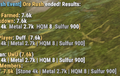 { "Chat": { "Use Prefix": true, "Prefix": "<color=#89CFF0>[OreRush Event]</color> ", "Channel (0=Global)": 0, "Icon SteamId": 76561198888888888 }, "Event": { "Only Command Start Event": false, "Minimum Players to Start Event": 1, "Event Minimum Interval (seconds)": 3600, "Event Maximum Interval (seconds)": 7200, "Event Duration Seconds": 30, "Allow Event To Spawn Near Monuments/Roads/Rails": false, "Minimum Distance From Monuments (meters) used When AllowEventToSpawnNearMonumentsRoadsRails = false": 250.0 }, "Announcements": { "Broadcast Start/End Messages": true, "Event Start Message": "<color=#ffd479>Ore Rush Event</color> <color=white>has started! Check your map.</color>", "Event End Message": "<color=#ffd479>Ore Rush Event</color> <color=white>has ended.</color>", "Play Start Notification Sound": true, "Start Sound FX #1 (empty = disabled)": "assets/bundled/prefabs/fx/invite_notice.prefab", "Start Sound FX #2 (empty = disabled)": "assets/bundled/prefabs/fx/item_unlock.prefab" }, "Announcement Option 2": { "Enabled (Announcement Option 2)": false, "Warn When X Minutes Left (0 = disabled)": 10, "Show End Summary": true, "Show Clan Winner": true, "Show Clan Member Breakdown": true, "Max Clan Member Lines": 8, "Start Message (RichText)": "<color=#ffd479>Ore Rush</color> started! Check your map.", "Warning Message (use {minutes})": "<color=#ffd479>Ore Rush</color>: <color=white>{minutes} minutes left!</color>", "End Message Header (RichText)": "<color=#ffd479>Ore Rush</color> ended! Results:\n", "Total Line Format (use {total})": "<color=#ffd479>• Total Farmed</color>: <color=#ffffff>{total}</color>", "End Total Line (use {total},{st},{m},{hq},{su})": "<color=#ffd479>• Breakdown</color>: <color=#ffffff>{total}</color> \n<color=#ffd479>[</color><color=#cfcfcf>Stone</color> <color=#ffffff>{st}</color> <color=#cfcfcf>Metal</color> <color=#ffffff>{m}</color> <color=#cfcfcf>HQM</color> <color=#ffffff>{hq}</color> <color=#cfcfcf>Sulfur</color> <color=#ffffff>{su}</color><color=#ffd479>]</color>\n", "End Top Player Line (use {name},{total},{st},{m},{hq},{su})": "<color=#ffd479>• Top Player</color>: <color=#ffffff>{name}</color> <color=#ffd479>(</color><color=#ffffff>{total}</color><color=#ffd479>)</color> \n<color=#cfcfcf>[Stone {st} | Metal {m} | HQM {hq} | Sulfur {su}]</color>\n", "Top Clan Line Format (use {clan},{total},{st},{m},{hq},{su})": "<color=white>Top Clan:</color> <color=#ffd479>{clan}</color> (<color=#ffd479>{total}</color>) \n[Stone {st} | Metal {m} | HQM {hq} | Sulfur {su}]", "Clan Members Header Line": "<color=#ffd479>• Clan Members</color>:", "Clan Member Line Format (use {name},{total},{st},{m},{hq},{su})": " <color=#cfcfcf>-</color> <color=#ffffff>{name}</color> <color=#ffd479>{total}</color> <color=#cfcfcf>[Stone {st} | Metal {m} | HQM {hq} | Sulfur {su}]</color>", "Play Start Notification Sound": true, "Start Sound FX #1 (empty = disabled)": "assets/bundled/prefabs/fx/invite_notice.prefab", "Start Sound FX #2 (empty = disabled)": "assets/bundled/prefabs/fx/item_unlock.prefab" }, "Discord Announcements": { "Event Start Announce": { "Enable": true, "Use Embed": true, "Use Embed Fields": true, "Embed Title": "OreRush Event", "Embed Color (Hex)": "#ffd479", "Include Resource Breakdown": true, "Include Clan Member Breakdown": true, "Max Clan Member Lines (Embed)": 8, "Footer Server Name (optional)": "", "Discord Webhook": "" }, "Event Stop Announce": { "Enable": false, "Use Embed": true, "Use Embed Fields": true, "Embed Title": "OreRush Event", "Embed Color (Hex)": "#ffd479", "Include Resource Breakdown": true, "Include Clan Member Breakdown": true, "Max Clan Member Lines (Embed)": 8, "Footer Server Name (optional)": "", "Discord Webhook": "" }, "Event Winner Announce": { "Enable": true, "Use Embed": true, "Use Embed Fields": true, "Embed Title": "OreRush Event", "Embed Color (Hex)": "#ffd479", "Include Resource Breakdown": true, "Include Clan Member Breakdown": true, "Max Clan Member Lines (Embed)": 8, "Footer Server Name (optional)": "", "Discord Webhook": "" } }, "UI": { "Show UI": false, "UI Update Interval Seconds": 1.0, "UI Title Text (RichText)": "<color=#ffd479>Ore Rush Event</color>", "UI Anchor X": 0.37, "UI Anchor Y": 0.98, "UI Use Handwriting Font": true, "UI Proximity Mode (only show when near dome)": true, "UI Proximity Range (meters)": 350.0, "Enable Stats Tracking (Top Leaderboard)": false, "Stats: Show Top Farmers Count": 5, "Leaderboard Anchor Min (x y)": "0.18 0.68", "Leaderboard Anchor Max (x y)": "0.42 0.97", "Leaderboard Font Size": 12, "Show Time In UI": true, "UI Time Format (use {time})": "Time Left: <color=#ffd479>{time}</color>", "UI Show Players Inside Line": true, "UI Players Inside Text (RichText)": "Players Inside: <color=#ffd479>{0}</color>" }, "Custom CUI - Use Only If You Understand How To Position Elements Correctly with Anchor's": { "Enable": true, "Image URL (direct .png/.jpg/.webp)": "", "Use ImageLibrary if available": true, "Anchor Min (x y)": "0.2 0.75", "Anchor Max (x y)": "0.8 0.92", "Offset Min (px px)": "0 0", "Offset Max (px px)": "0 0", "Color (r g b a)": "1 1 1 1", "Players Inside Count": { "Enable": true, "Show Background Box": true, "Background Color (r g b a)": "1 0 0 0.25", "Anchor Min (x y)": "0.152 0.18", "Anchor Max (x y)": "0.268 0.62", "Offset Min (px px)": "0 0", "Offset Max (px px)": "0 0", "Font Size": 36, "Color (r g b a)": "1 1 1 1" }, "Clans Inside Count": { "Enable": true, "Show Background Box": true, "Background Color (r g b a)": "1 0 0 0.25", "Anchor Min (x y)": "0.72 0.18", "Anchor Max (x y)": "0.88 0.62", "Offset Min (px px)": "0 0", "Offset Max (px px)": "0 0", "Font Size": 36, "Color (r g b a)": "1 1 1 1", "Format (use {count})": "{count}" }, "Countdown Timer": { "Enable": true, "Show Background Box": true, "Background Color (r g b a)": "1 0 0 0.25", "Anchor Min (x y)": "0.35 0.35", "Anchor Max (x y)": "0.65 0.65", "Offset Min (px px)": "0 0", "Offset Max (px px)": "0 0", "Font Size": 36, "Color (r g b