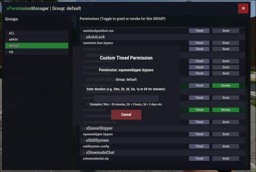 /* Gives a permission to a user */ xpm.giveuserperm <steamId> <permission> /* Revokes a permission from a user */ xpm.revokeuserperm <steamId> <permission> /* Gives a permission to a group */ xpm.givegroupperm <groupName> <permission> /* Revokes a permission from a group */ xpm.revokegroupperm <groupName> <permission> /* Adds a user to a group */ xpm.addusertogroup <steamId> <groupName> /* Removes a user from a group */ xpm.removeuserfromgroup <steamId> <groupName> /* Gives a timed permission to a user (supports 30m, 2h, 7d, 3w, 1y etc.) */ xpm.giveusertimed <steamId> <permission> <duration> /* Gives a timed permission to a group (supports 30m, 2h, 7d, 3w, 1y etc.) */ xpm.givegrouptimed <groupName> <permission> <duration> /* Removes timed permission entries for a user (Does NOT revoke normal permission!) */ xpm.revokeusertimed <steamId> <permission> /* Removes timed permission entries for a group (Does NOT revoke normal permission!) */ xpm.revokegrouptimed <groupName> <permission> /* Returns remaining timed minutes for a user permission */ xpm.getusertimedremaining <steamId> <permission> /* Returns remaining timed minutes for a group permission */ xpm.getgrouptimedremaining <groupName> <permission> /* Lists all timed permissions active for a user */ xpm.listusertimed <steamId> /* Lists all timed permissions active for a group */ xpm.listgrouptimed <groupName>