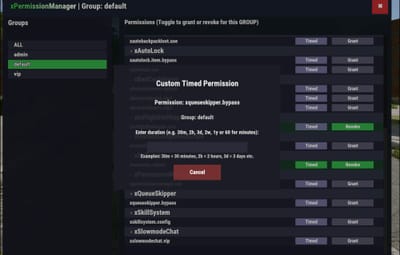 /* =============== DURATION FORMAT EXAMPLES ============== */ 30m | 2h | 3d | 4w | 1y | 60 (plain number = minutes) /* ==================== GRANTS ==================== */ /* Gives a permission to a user */ xpm.grantuser <steamId> <permission> /* Gives a permission to a group */ xpm.grantgroup <groupName> <permission> /* Adds a user to a group */ xpm.addusergroup <steamId> <groupName> /* Adds a user to a timed group */ xpm.addusergrouptimed <steamId> <groupName> <duration> /* Gives a timed permission to a user */ xpm.grantusertimed <steamId> <permission> <duration> /* Gives a timed permission to a group */ xpm.grantgrouptimed <groupName> <permission> <duration> /* ==================== REVOKES ==================== */ /* Revokes a permission from a user */ xpm.revokeuser <steamId> <permission> /* Revokes a permission from a group */ xpm.revokegroup <groupName> <permission> /* Removes a user from a group */ xpm.revokeusergroup <steamId> <groupName> /* Removes a user from a timed group */ xpm.revokeusergrouptimed <steamId> <groupName> /* Deletes a timed permission entry from a user (does not revoke normal permission) */ xpm.revokeusertimed <steamId> <permission> /* Deletes a timed permission entry from a group (does not revoke normal permission) */ xpm.revokegrouptimed <groupName> <permission> /* ==================== TIMED INFO ==================== */ /* Gets remaining time for one user timed permission */ xpm.getusertimed <steamId> <permission> /* Lists all active timed permissions for a user */ xpm.listusertimed <steamId> /* Gets remaining time for one timed group permission */ xpm.getgrouptimed <groupName> <permission> /* Lists all active timed permissions for a group */ xpm.listgrouptimed <groupName>