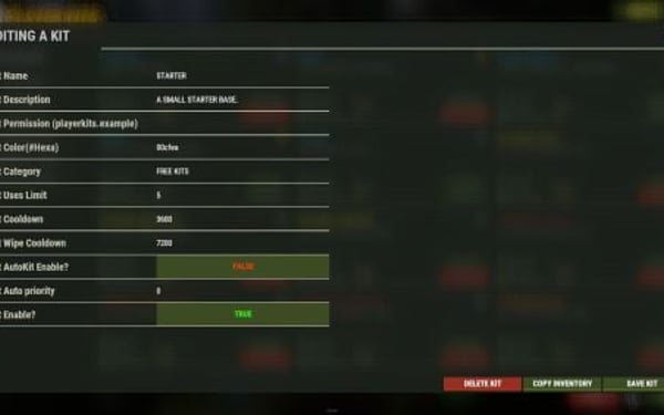 Quote{ "Kit Chat Commands": [ "kitmenu", "kitlist", "kits", "kit" ], "Chat Prefix": "<color=#FFD700>[PlayerKits]</color> »", "Chat Avator": 0, "Setting": { "Wipe player data when the server is wiped": true, "Give spawn kits to players": true, "Allow players to toggle spawn kits on spawn": true }, "UI Settings": { "Background UI": { "Hexa Color(#FFFFFF,100)": "#000000,90" }, "Background Image Full": "", "Topbar UI": { "Background Color": { "Hexa Color(#FFFFFF,100)": "#000000,0" }, "Background Image": "", "Display Name": "PLAYER KITS", "Logo URL": "https://rustlabs.com/img/skins/324/10197.png", "Bar Color": { "Hexa Color(#FFFFFF,100)": "#BFBFAC,100" } }, "Category UI": { "Background Color": { "Hexa Color(#FFFFFF,100)": "#000000,0" }, "Background Image": "", "Display Name": "CATEGORY", "Category List Active Color": { "Hexa Color(#FFFFFF,100)": "#FFC700,60" }, "Category List Inactive Color": { "Hexa Color(#FFFFFF,100)": "#3C4B24,60" } }, "Kit List UI": { "Background Color": { "Hexa Color(#FFFFFF,100)": "#000000,0" }, "Background Image": "", "Kit Background Color": { "Hexa Color(#FFFFFF,100)": "#1B201B,90" }, "Kit Description Color": { "Hexa Color(#FFFFFF,100)": "#BFBFAC,100" }, "Kit Bookmark Icon": "https://i.postimg.cc/VkyrF9vf/star.png", "Kit Description Font": "robotocondensed-bold.ttf", "Kit Description Font Size": 12, "Kit Infos Name Color": { "Hexa Color(#FFFFFF,100)": "#9CD293,100" }, "Kit Infos Value Color": { "Hexa Color(#FFFFFF,100)": "#E7E277,100" }, "Kit Icons Color": { "Hexa Color(#FFFFFF,100)": "#9CD293,100" }, "Kit Limit Icon": "https://i.postimg.cc/Rhsdz9t2/warning.png", "Kit Cooldown Icon": "https://i.postimg.cc/hj0MpVtD/timer-1.png", "Kit WipeCooldown Icon": "https://i.postimg.cc/0j2n3rzp/time.png" } } }