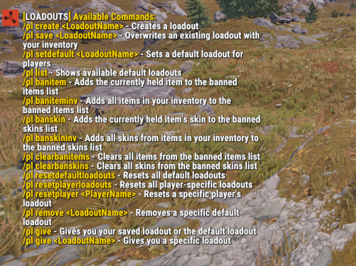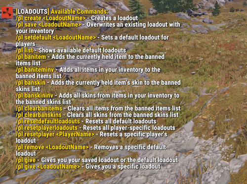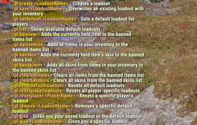 Quote/pl create <LoadoutName> - Creates a loadout copying your inventory /pl save <LoadoutName> - Overwrites an existing loadout with your inventory /pl setdefault <LoadoutName> - Sets a default loadout for players /pl list - Shows available default loadouts /pl banitem - Adds the currently held item to the banned items list /pl baniteminv - Adds all items in your inventory to the banned items list /pl banskin - Adds the currently held item's skin to the banned skins list /pl banskininv - Adds all skins from items in your inventory to the banned skins list /pl clearbanitems - Clears all items from the banned items list /pl clearbanskins - Clears all skins from the banned skins list /pl resetdefaultloadouts - Resets all default loadouts /pl resetplayerloadouts - Resets all player-specific loadouts /pl resetplayer <PlayerName> - Resets a specific player's loadout /pl remove <LoadoutName> - Removes a specific default loadout /pl give - Gives you your saved loadout or the default loadout /pl give <LoadoutName> - Gives you a specific loadout