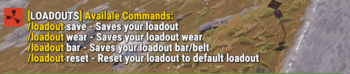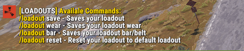 Quote{ "Default Loadout": "Default", "Black listed Items (ShortNames - https://www.corrosionhour.com/rust-item-list/)": [ "rock", "hammer", "rifle.ak" ], "Black listed Skin IDs": [ 69, 6969, 696969 ], "Whitelisted Items (Perms Based)": [ { "vip": [ "rifle.ak", "l96" ], "vip2": [ "rock", "hammer" ] } ], "Whitelisted Skins (Perms Based)": [ { "vip": [ 69, 6969 ], "vip2": [ 6969, 69 ] } ], "Chat Setting": { "Chat Avatar": 0, "Chat Prefix": "<color=#FFD700>[</color>LOADOUTS<color=#FFD700>]</color> " }, "Version": { "Major": 1, "Minor": 0, "Patch": 0 } }{ "PlayerHelp": "<color=#FFD700>Availale Commands:</color>\n<color=#FFD700>/loadout</color> save - Saves your loadout\n<color=#FFD700>/loadout</color> wear - Saves your loadout wear\n<color=#FFD700>/loadout</color> bar - Saves your loadout bar/belt\n<color=#FFD700>/loadout</color> reset - Reset your loadout to default loadout", "AdminHelp": "<color=#FFD700>Available Commands:</color>\n<color=#00FF00>/pl create <LoadoutName></color> - <color=#808080>Creates a loadout</color>\n<color=#00FF00>/pl save <LoadoutName></color> - <color=#808080>Overwrites an existing loadout with your inventory</color>\n<color=#00FF00>/pl setdefault <LoadoutName></color> - <color=#808080>Sets a default loadout for players</color>\n<color=#00FF00>/pl list</color> - <color=#808080>Shows available default loadouts</color>\n<color=#00FF00>/pl banitem</color> - <color=#808080>Adds the currently held item to the banned items list</color>\n<color=#00FF00>/pl baniteminv</color> - <color=#808080>Adds all items in your inventory to the banned items list</color>\n<color=#00FF00>/pl banskin</color> - <color=#808080>Adds the currently held item's skin to the banned skins list</color>\n<color=#00FF00>/pl banskininv</color> - <color=#808080>Adds all skins from items in your inventory to the banned skins list</color>\n<color=#00FF00>/pl clearbanitems</color> - <color=#808080>Clears all items from the banned items list</color>\n<color=#00FF00>/pl clearbanskins</color> - <color=#808080>Clears all skins from the banned skins list</color>\n<color=#00FF00>/pl resetdefaultloadouts</color> - <color=#808080>Resets all default loadouts</color>\n<color=#00FF00>/pl resetplayerloadouts</color> - <color=#808080>Resets all player-specific loadouts</color>\n<color=#00FF00>/pl resetplayer <PlayerName></color> - <color=#808080>Resets a specific player's loadout</color>\n<color=#00FF00>/pl remove <LoadoutName></color> - <color=#808080>Removes a specific default loadout</color>\n<color=#00FF00>/pl give</color> - <color=#808080>Gives you your saved loadout or the default loadout</color>\n<color=#00FF00>/pl give <LoadoutName></color> - <color=#808080>Gives you a specific loadout</color>", "NoPerm": "You don't have permission to use this command.", "Save": "Your loadout has been saved.", "Bar": "Your loadout bar has been saved.", "Wear": "Your loadout wear has been saved.", "Reset": "Your loadout has been removed.", "NoLoadout": "No loadout data found.", "ItemBlackListed": "<color=#DC143C>{0}</color> item is black listed & will not be saved on your loadout.", "SkinBlackListed": "<color=#DC143C>{0}</color> item skin is black listed & will not be saved on your loadout." }