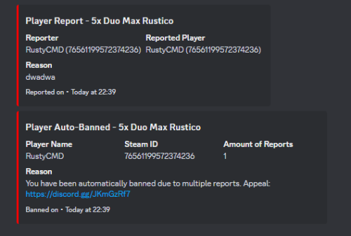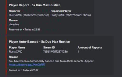 { "Discord Webhook URL": "https://discord.com/api/webhooks/yourwebhookhere", "Ban Notification Webhook URL": "https://discord.com/api/webhooks/yourwebhookhere", "Server Shortname": "5x Duo Max Rustico", "Admin Notification": true, "Ban Appeal Link": "https://discord.gg/JKmGzRf7", "Maximum Reports Before Auto Ban": 10 }