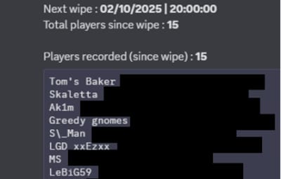 PlayersSinceWipe is a powerful Rust plugin designed to track all players connected since the last wipe. It supports different wipe modes (Monthly, Weekly, BiWeekly) and automatically sends daily or manual reports to Discord via webhook.