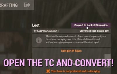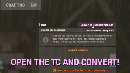 Converting a valid building to a pocket dimension should NOT be free - and it isn't. By default, players need to deposit 500 Scrap into the TC - or have that amount ready in their inventory, both will work. You can adjust the amount and the shortname of the currency item in your config to your liking. You can even make it so that not only the shortname of this currency item is checked, but also its skin - useful if you have plugins that come with custom items.