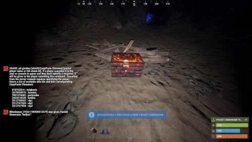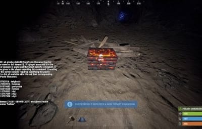 - pocketdimensions.deploy.pickup - holders of this permission can deploy and pick up Pocket Dimension boxes, be it already existing ones and fresh ones based on skin ID/Copy Paste file combo in your config. Of course, this takes into account building block/other conditions, too.