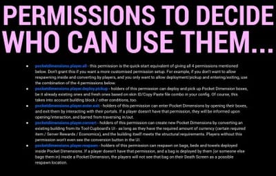 - pocketdimensions.player.enter.exit - holders of this permission can enter Pocket Dimensions by opening their boxes, and exit them by interacting with their portals. If a player doesn't have that permission, they will be informed upon opening/interaction, and barred from traversing in/out.