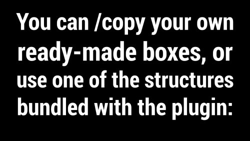 Use this command to create a Small Wooden Box item, skinned with a special skin mentioned in your config, and then given to a player. A new Pocket Dimension based on the Copy Paste template will be created inside of that box the first time it's deployed somewhere.