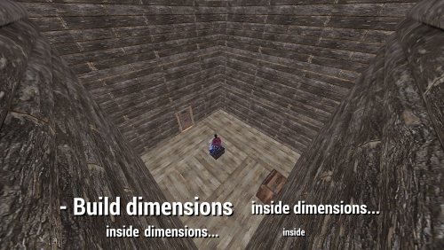 - As a player: make a 3 x 3 x 3 cube that meets the validity requirements (more on that below) - if you have the proper permission and the appropriate amount of required currency, open the Tool Cupboard and press the pink "Convert to Pocket Dimension" button. If built correctly, you will now receive a box containing that entire cube inside. Alternatively, deploy a new Small Wooden Box skinned with a skin ID mentioned in the config that references a valid Copy Paste template - no construction by players necessary, but still possible. This plugin comes with several pre-built, already known to be valid Pocket Dimensions, ready to be enjoyed by your players.