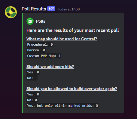 - /startpoll <duration> - Start a poll using the settings in the config file.