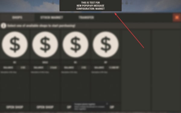 bool AddNewPopUpSchema(string pluginName, JObject schema) #Allows you to call plugin to create new pop-up preset for your plugin. EXAMPLE USAGE: JObject popUpConfig = new JObject() { { "key", "Market" }, #<- Config Key value. { "anchor", "0.5 1" }, { "name", "Legacy" }, { "parent", "Hud.Menu" }, { "background_enabled", true }, { "background_color", "0.145 0.135 0.12 1" }, { "background_fadeIn", 0.5f }, { "background_fadeOut", 0.5f }, { "background_offsetMax", "180 0" }, { "background_offsetMin", "-180 -65" }, { "background_smooth", false }, { "background_url", "" }, { "background_additionalObjectCount", 1 }, #<- This is value how many details is in this schema. { "background_detail_0_color", "0.185 0.175 0.16 1" }, { "background_detail_0_offsetMax", "356 65" }, { "background_detail_0_offsetMin", "4 4" }, { "background_detail_0_smooth", false }, { "background_detail_0_url", "" }, { "text_anchor", "MiddleCenter" }, { "text_color", "0.91 0.87 0.83 1" }, { "text_fadeIn", 0.5f }, { "text_fadeOut", 0.5f }, { "text_font", "RobotoCondensed-Bold.ttf" }, { "text_offsetMax", "180 0" }, { "text_offsetMin", "-180 -65" }, { "text_outlineColor", "0 0 0 0" }, { "text_outlineSize", "0 0" } }; PopUpAPI.Call("AddNewPopUpSchema", Name, popUpConfig);