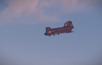 When the CH47 arrives in the Event zone, it will fail to control and crash in a cooling tower of the power plant. All the crates from the CH47 will be on the top of the cooling tower. But they will be in the fire. You need put out the fire to get access to the crates.
