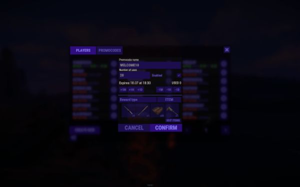 The promo code plugin for Rust game provides the ability to reward players for entering a code word. This plugin includes a variety of settings and functionality for easy management and configuration of promo codes in the admin panel.
