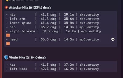 ", "Embed Color (Decimal)": 15158332 }, "Logging Settings": { "Combat Log Timeout (seconds)": 30, "Ignored Weapons (short prefab names)": [ "knife.bone", "knife.combat", "machete", "salvaged.sword", "longsword", "rock", "torch", "stone.pickaxe", "stonehatchet", "hammer", "chainsaw", "butcher.cleaver" ] }, "Suspicion Flag Settings": { "Enable Suspicion Flags": true, "Minimum Hits for Analysis": 4, "Night Time Start Hour (24h)": 20, "Night Time End Hour (24h)": 6, "Long Range Threshold (meters)": 125.0, "High Headshot Percentage Threshold (0.0 to 1.0)": 0.7, "Flag Points (Points added to player's permanent score for each flag)": { "HighHSP": 2, "RoboticTiming": 3, "LongRangeHeadshot": 2, "NightOrFogKill": 1, "AirborneKill": 3, "Wallbang": 5 }, "High Suspicion Alert Score Threshold (triggers high-priority webhook)": 25 }, "Auto-Ban Settings": { "Enable Automatic Banning": true, "Score Threshold to Trigger Ban": 100, "Ban Reason Message": "Banned by automated system for accumulating a high suspicion score." }, "Version": { "Major": 1, "Minor": 0, "Patch": 1 } }
