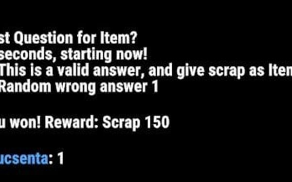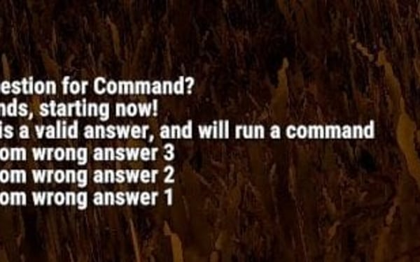 This plugin make it possible, to have a Question database, with 1 valid and 1 to several invalid answer, and it will post a question into the chat in every configured X time, for configured Y time long. It support 4 different reward type, Economy, ServerReward, Item and Command.
