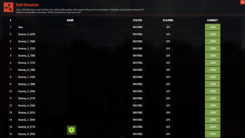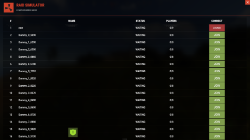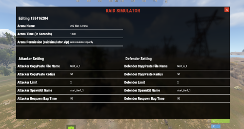 Quote{ "Use Raid Simulator Lobby?": true, "Chat Setting": { "Chat Avatar": 0, "Chat Prefix": "<color=#DC143C>[Raid Simulator]</color>: " }, "Lobby Position": { "x": 0, "y": 0, "z": 0 }, "CopyPaste Paste Args": [ "stability", "false", "autoheight", "false", "entityowner", "false", "height", "2.8" ], "RS Join Command": [ "play", "join" ], "VIP Arena Options Command": [ "vip", "setting" ], "Lobby Kit": "RaidSimulatorLobbyKit", "Raid UI Setting": { "Title": "Raid Simulator", "Short Description": "Join a Raid Simulator event and test your raiding skills against other players! Choose to be an Attacker or Defender and experience intense PvP action in a controlled environment. Perfect for practice or just some fun!", "Logo Image URL": "https://i.postimg.cc/QMmFPsp7/94646abece675be28d75439327f4f5ec.png" }, "Version": { "Major": 2, "Minor": 0, "Patch": 0 } }