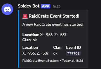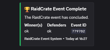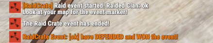 > RaidCrate Event: [XYZ x DEF] have successfully RAIDED [ABC]'s base!