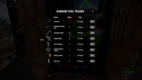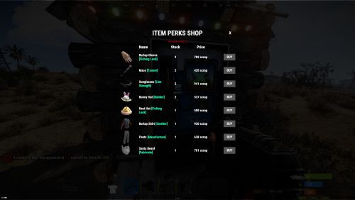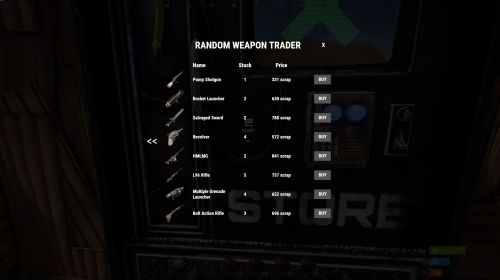 When a player interacts with the vending machine they are presented with randomly selected items from the shop profile, which are given random stock amounts and a random scrap/econ/SRP price.