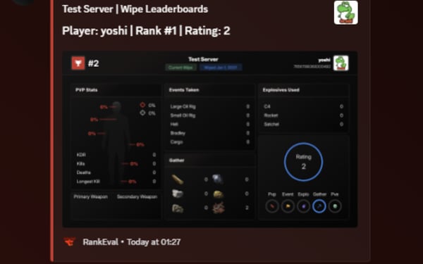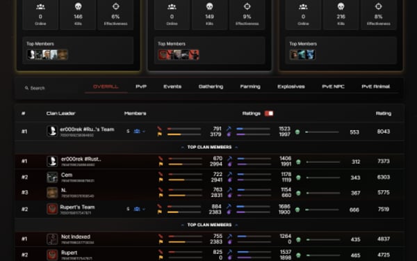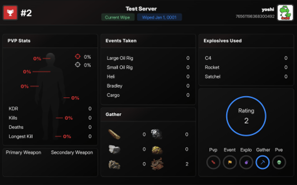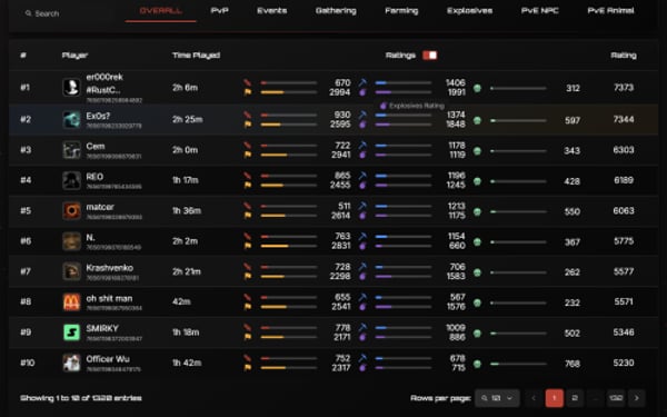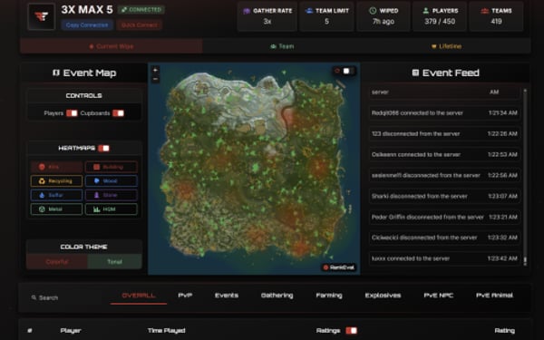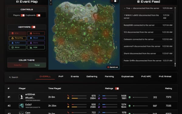 Track 178 Unique Player StatisticsFrom kill/death ratios to building and farming efficiency, we process them through our proprietary rating algorithm to generate fair, flexible rankings. You can configure leaderboards for different modes and filter, rank, and embed them based on your community's needs. Visualize performance live with Event Maps™, a real-time heatmap showing player positions, hotspots, and PvP activity as it happens. Perfect for post-wipe analysis, staff review, and community engagement.