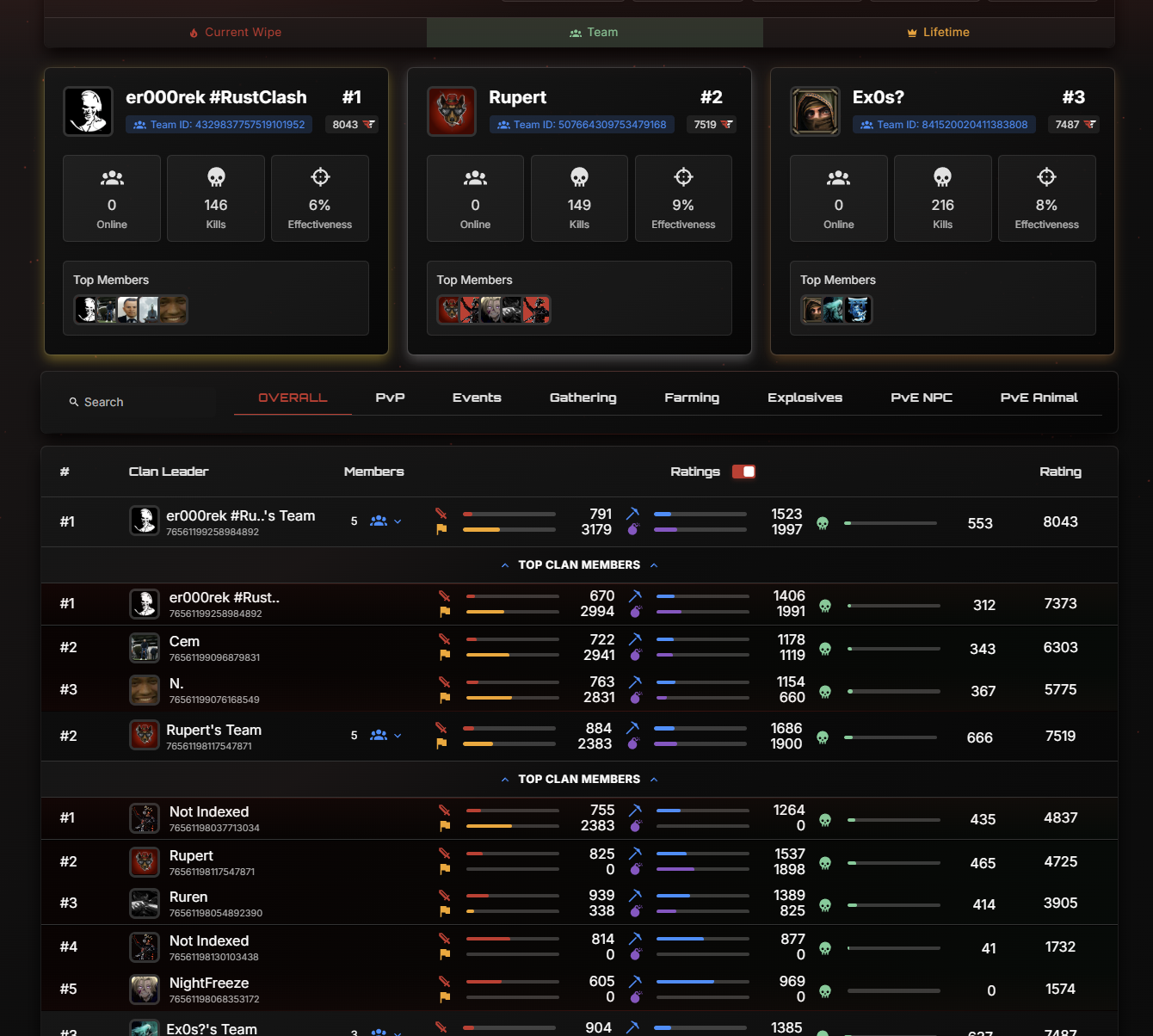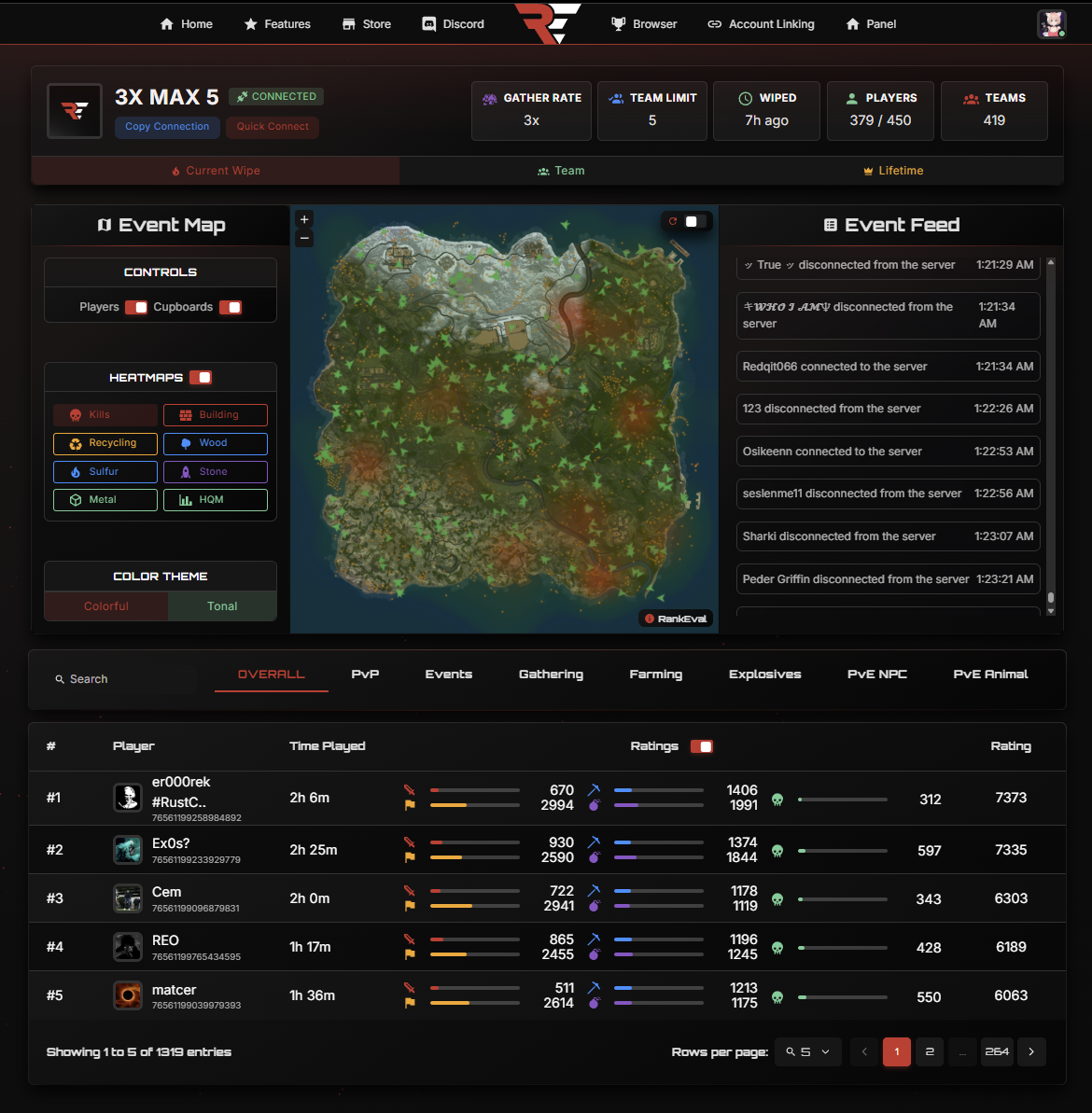 Track 178 Unique Player StatisticsFrom kill/death ratios to building and farming efficiency, we process them through our proprietary rating algorithm to generate fair, flexible rankings. You can configure leaderboards for different modes and filter, rank, and embed them based on your community's needs. Visualize performance live with Event Maps™, a real-time heatmap showing player positions, hotspots, and PvP activity as it happens. Perfect for post-wipe analysis, staff review, and community engagement.