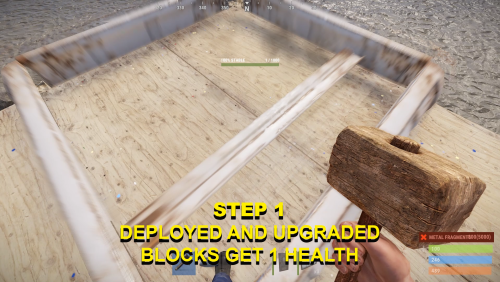 Newly built thatch block will have its health set to 1 by default or to your configured value. After upgrading it it will keep its last health, so if you repair it to 10 and upgrade it to stone, the upgraded stone block will have 10 health after upgrade. This means every block you build you will also need to hit it with your hammer until the health is filled up. You can also set deployables to work with this plugin.