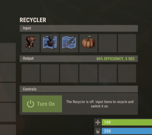 - Allow for random output (recycle a sleeping bag and get 500 wood, or 3 sheet metal doors for example)