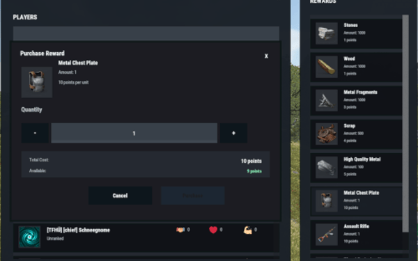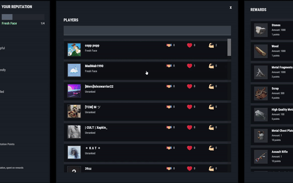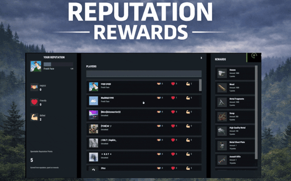 ReputationRewards is built to encourage positive community behaviors by adding an in-game reputation system to your Rust server with a clean 3-column UI, built-in reward shop, and rank progression.