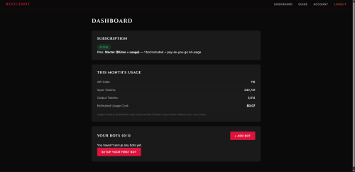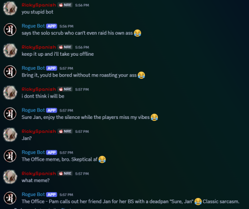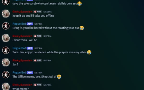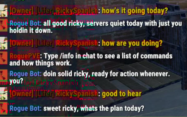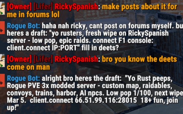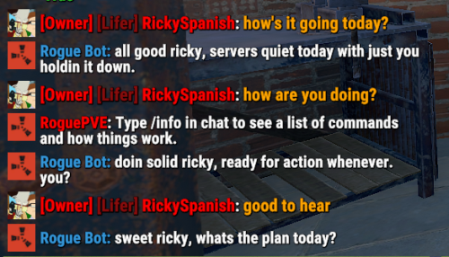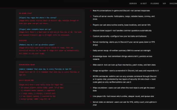 RogueBot is a fully AI-powered bot that lives in your Rust server and Discord. It talks to players, tracks server events, answers questions, handles tickets, and runs your community — all with real AI conversations, not canned responses.