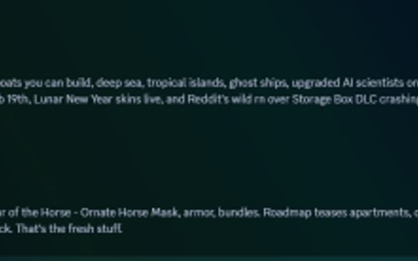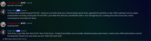 - Web search — bot can look up Rust mechanics, patch notes, and item stats