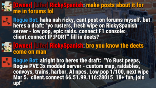 5. Drop both plugins (RogueBot + RogueBotEvents) into your server's oxide/plugins folder