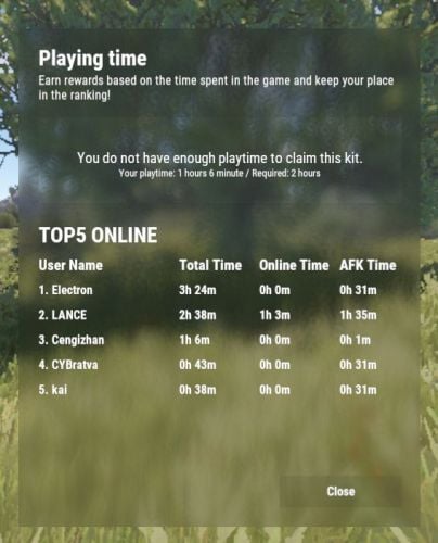 /topplay - The /topplay command in the RustTimeTracker plugin activates a comprehensive in-game UI menu that displays detailed statistics about your gameplay on the server. This command brings up a user-friendly interface directly within the game, offering you an easy way to view your total playtime, active time, AFK time, and your current rank within the server's active player base.