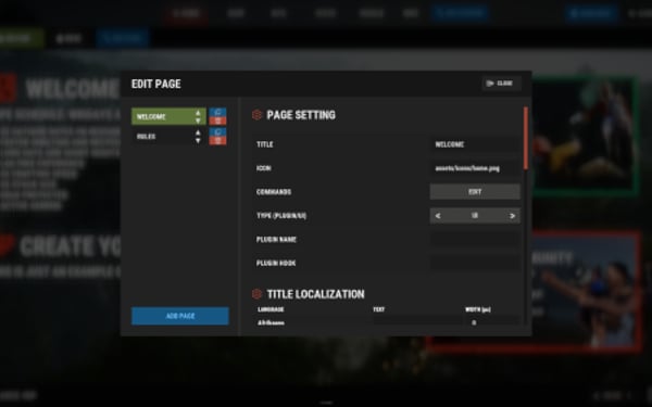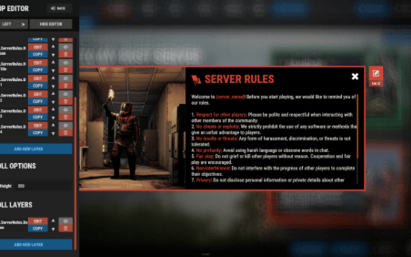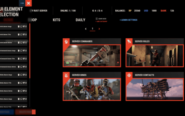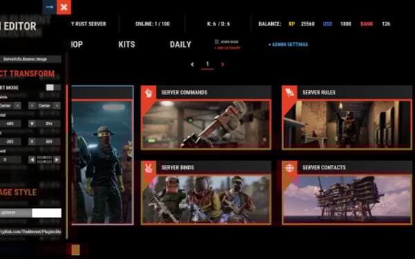[PluginReference] private Plugin ServerPanel; private int _serverPanelCategoryID = -1; private void OnServerInitialized() { ServerPanel?.Call("API_OnServerPanelProcessCategory", Name); } private void OnReceiveCategoryInfo(int categoryID) { _serverPanelCategoryID = categoryID; } private void OnServerPanelCategoryPage(BasePlayer player, int category, int page) { // Cleanup when player switches categories } private CuiElementContainer API_OpenPlugin(BasePlayer player) { var container = new CuiElementContainer(); // Create base panels (required structure) container.Add(new CuiPanel() { RectTransform = {AnchorMin = "0 0", AnchorMax = "1 1"}, Image = {Color = "0 0 0 0"} }, "UI.Server.Panel.Content", "UI.Server.Panel.Content.Plugin", "UI.Server.Panel.Content.Plugin"); container.Add(new CuiPanel() { RectTransform = {AnchorMin = "0 0", AnchorMax = "1 1"}, Image = {Color = "0 0 0 0"} }, "UI.Server.Panel.Content.Plugin", "YourPlugin.Background", "YourPlugin.Background"); // Add your plugin's UI elements here container.Add(new CuiLabel { RectTransform = {AnchorMin = "0.1 0.8", AnchorMax = "0.9 0.9"}, Text = {Text = "Your Plugin Interface", FontSize = 16, Align = TextAnchor.MiddleCenter, Color = "1 1 1 1"} }, "YourPlugin.Background", "YourPlugin.Title"); // Add buttons, panels, etc. using "YourPlugin.Background" as parent return container; } private void OnServerPanelClosed(BasePlayer player) { // Cleanup when panel closes }