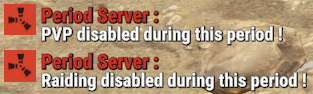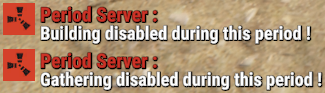 - This plugin offers a complete periodic event system for your Rust server, allowing you to create structured game phases with customizable restrictions. Each period can independently control PvP, raiding, gathering, and building permissions, providing a dynamic gameplay experience. It includes a persistent, real-time user interface displaying the current period name and remaining time, with an automatic "Next Period" indicator, and the execution of custom server commands for each period.