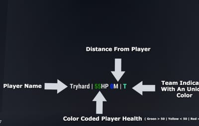 - Enhanced Player Tracking: Displays players' names, distances, and health status, along with a unique team color indicator for easy differentiation.