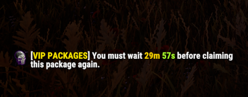{ "PackageDoesNotExist": "[<color=yellow>VIP PACKAGES</color>] This package does not exist.", "CannotClaim": "[<color=yellow>VIP PACKAGES</color>] You do not have permission to claim this package.", "NotEnoughInventory": "[<color=yellow>VIP PACKAGES</color>] You do not have enough inventory space to claim this package. You need <color=green>{0}</color> inventory slots.", "PackageReady": "[<color=yellow>VIP PACKAGES</color>] Your {0} package is ready to claim using the /<color=blue>{1}</color> command!", "CooldownRemaining": "[<color=yellow>VIP PACKAGES</color>] You must wait {0} before claiming this package again." }