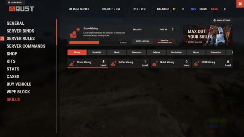 Skills comes with a massive library of pre-configured skills covering every aspect of Rust gameplay. All skills are ready to use with balanced 10-level progression systems!