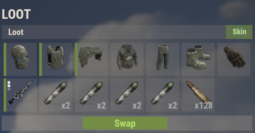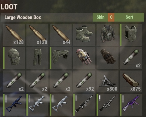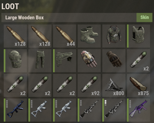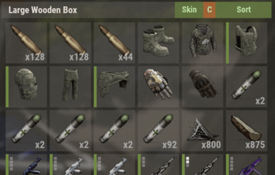 Take advantage of our user-friendly interface. Utilize the new button displayed in compatible item containers such as lockers, boxes, coffins, and more. With your saved skin preferences, you're now able to apply a skin to all items in a target inventory. Or utilize the skin inventory command to apply your skins to everything on your character.