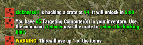 { "Enable Grid Broadcast": true, "Prevent others from looting": false, "Allow Clan members/allies to loot while protected (Requires Clan Plugin)": true, "Reducer Item Distance": 10.0, "Rank Settings": { "default": { "Unlock Seconds": 900, "Enable Item Reduce": false, "Reducer item ShortName": "targeting.computer", "Required SkinId": 0, "Seconds reduced by using item": 100, "Maximum times reduced": 1, "Number of items used per reduction": 1 }, "vip": { "Unlock Seconds": 600, "Enable Item Reduce": false, "Reducer item ShortName": "targeting.computer", "Required SkinId": 0, "Seconds reduced by using item": 100, "Maximum times reduced": 1, "Number of items used per reduction": 1 }, "vip2": { "Unlock Seconds": 300, "Enable Item Reduce": false, "Reducer item ShortName": "targeting.computer", "Required SkinId": 0, "Seconds reduced by using item": 100, "Maximum times reduced": 1, "Number of items used per reduction": 1 } }, "Version": { "Major": 1, "Minor": 0, "Patch": 7 } }