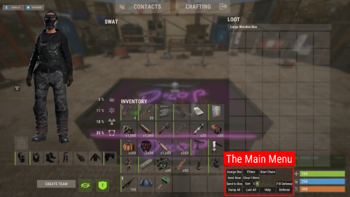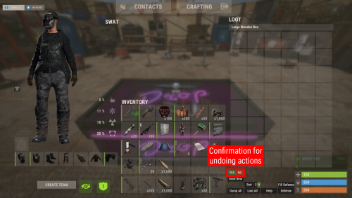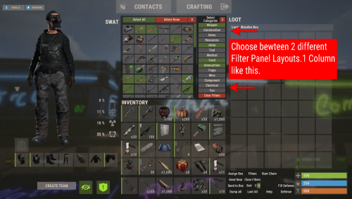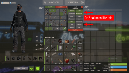 Broad category filtering (Resources, Weapons, Ammo) or laser-focused item selection. You decide exactly what goes where.