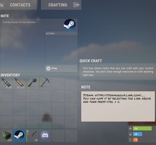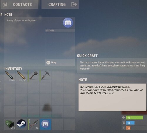 This plugin helps your players to easily reach discord and steam addresses. When players enter the game for the first time, a menu will appear and they can click on their discord and steam addresses and copy them. At the same time, players are given two papers with discord and steam arrows. In the content of these papers, you can send the steam and discord addresses together with the note you wrote to the user.
