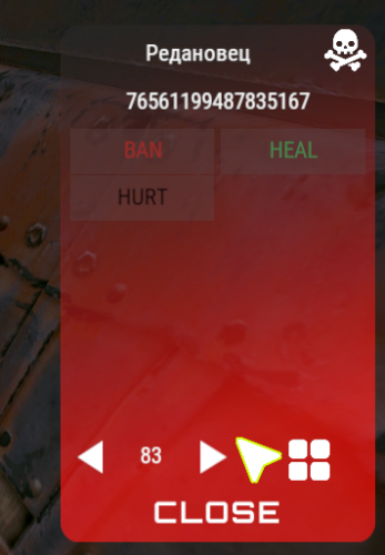 { "Panel position": { "AnchorMin": "1 0.5", "AnchorMax": "1 0.5", "OffsetMin": "-200 -170", "OffsetMax": "-10 170" }, "Button customization": [ { "Button title": "BAN", "Special Function (if you just need a command, leave the field blank)": "BanMenu", "Command ([ID] is replaced by the ID of the suspect)": "", "Premission for button": "SpectatorPlus.canban" }, { "Button title": "", "Special Function (if you just need a command, leave the field blank)": "HPControl", "Command ([ID] is replaced by the ID of the suspect)": "", "Premission for button": "SpectatorPlus.CanHPControl" }, { "Button title": "CALL", "Special Function (if you just need a command, leave the field blank)": "", "Command ([ID] is replaced by the ID of the suspect)": "call [ID]", "Premission for button": "SpectatorPlus.Cancall" } ], "Ban reasons": [ { "Title": "HACKING", "Command ([ID] is replaced by the ID of the suspect)": "ban [ID] 30d SOFT" }, { "Title": "MACRO", "Command ([ID] is replaced by the ID of the suspect)": "ban [ID] 30d MACRO" }, { "Title": "MUTE: insults", "Command ([ID] is replaced by the ID of the suspect)": "mute [ID] 1h insults" } ], "Another Settings": { "How much HP to heal/injure the observed by the Heal/Hurt button": 10.0 }, "Positions of buttons with actions (needed to place the buttons in a given order) I do not recommend changing this, otherwise the buttons may not be drawn correctly": [ { "OffsetMin": "-92 83", "OffsetMax": "-2 108" }, { "OffsetMin": "2 83", "OffsetMax": "92 108" }, { "OffsetMin": "-92 55", "OffsetMax": "-2 80" }, { "OffsetMin": "2 55", "OffsetMax": "92 80" }, { "OffsetMin": "-92 27", "OffsetMax": "-2 52" }, { "OffsetMin": "2 27", "OffsetMax": "92 52" }, { "OffsetMin": "-92 -1", "OffsetMax": "-2 24" }, { "OffsetMin": "2 -1", "OffsetMax": "92 24" } ] }