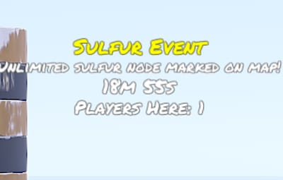During the Unlimited Sulfur Event, a large sulfur node appears at a set location(s) and is marked on the map, drawing attention to all players. This node provides unlimited sulfur, giving players a chance to collect a significant amount of sulfur within a limited time. This event can add an extra layer of competition and cooperation among your players as they rush to take advantage of these lucrative opportunities.
