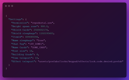 { "Settings": { "Permission": "svpedestal.use", "Height spawn zone": 900.0, "SkinId Cards": 2560602174, "SkinId sleepbags": 1102195403, "ItemId": 609049394, "Name sleepbags": "Zone", "Chat Tag": "[SV_ZONE]", "Name Cards": "ZONE_CARD", "Font size": 16, "Building Grade": 4, "Time teleport": 10, "Effect teleport": "assets/prefabs/locks/keypad/effects/lock.code.denied.prefab" } }