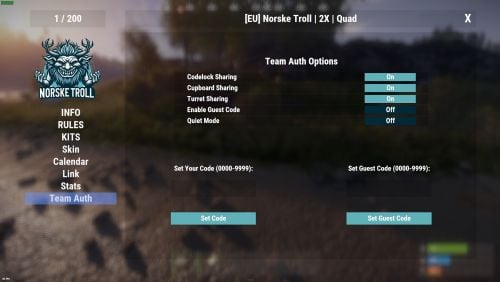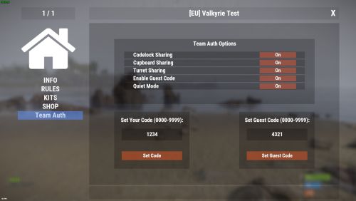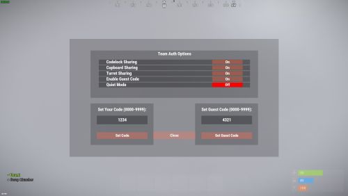 Teamshare Allows automatic team auth on codelocks, turrets, and tool cupboards via the /share command, including guest code functionality
